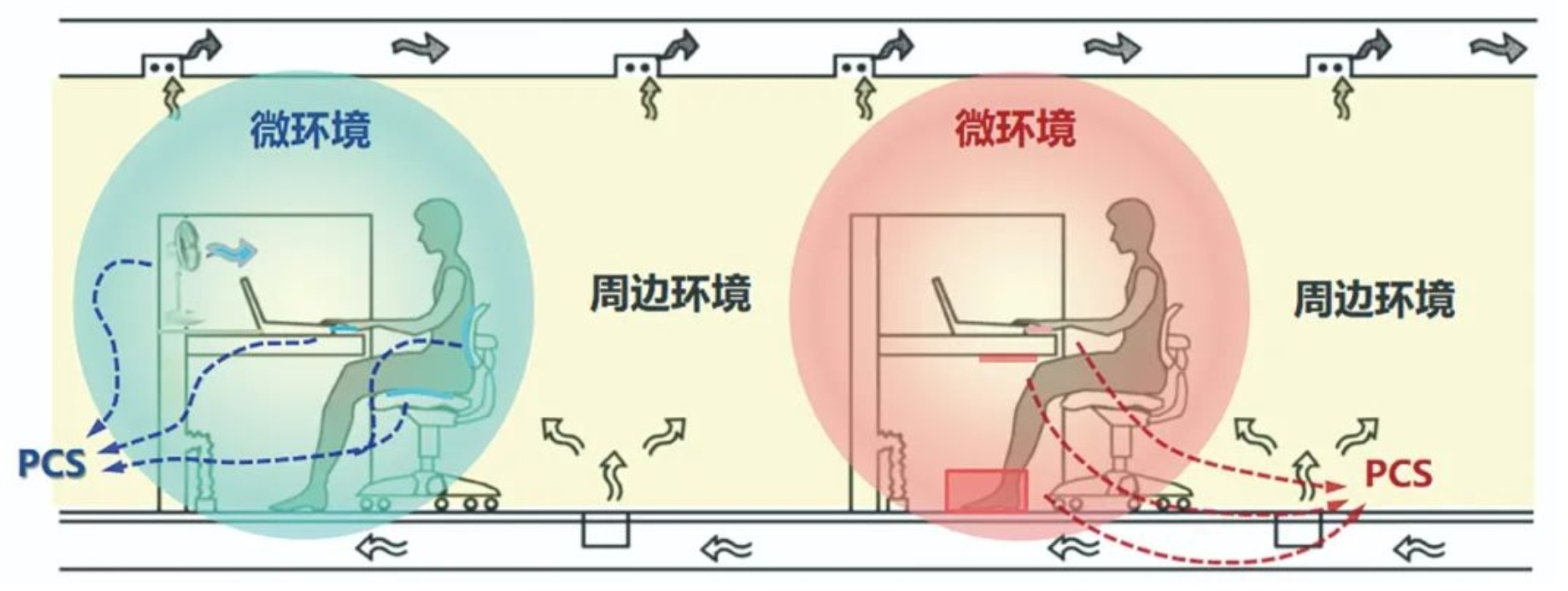 传统的空调系统提供的冷量或者热量,绝大部分都消耗在空气或室内表面这些中间传热媒介上,而真正作用于人体的能量占比很小,从满足人员舒适性需求这一视角来看,是能源消耗较大的方式。而PCS旨在为人员提供个体尺度的“精准热服务”,将冷量或热量直接提供给人体,从而可以放宽对背景环境的要求。当同一空间内有多人存在、空调设备无法满足需求差异的时候,可以由空调设备营造一个较为宽松的背景热环境,各人通过PCS营造自己需要的热环境。目前,PCS已被认为是降低空调能耗并同时提高人员舒适度的有效手段。
