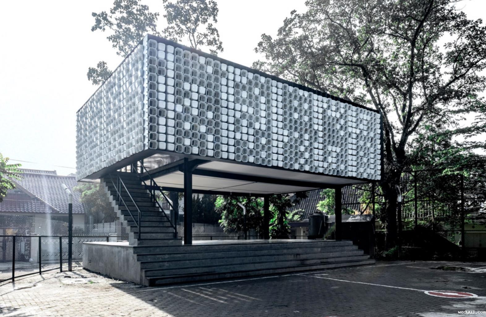 图中的这个小型社区图书馆位于印度尼西亚,旨在为当地社区的教学和其他活动提供空间,减低文盲率和辍学率。建造图书馆时,设计师们试图找到一种经济实惠的当地可用材料,既能提供遮荫,又能让空气和自然光到达室内,规格一致、数量众多的废弃冰淇淋桶正合适不过。这些冰激凌桶被固定在垂直钢肋上并向外倾斜,可以在透光通风的同时实现防雨。在布置冰激凌桶时,设计师们还利用桶的正反两端拼出了一句话“buku adalah jendela dunia(书籍是世界的窗户)”,以此鼓励更多社区儿童。