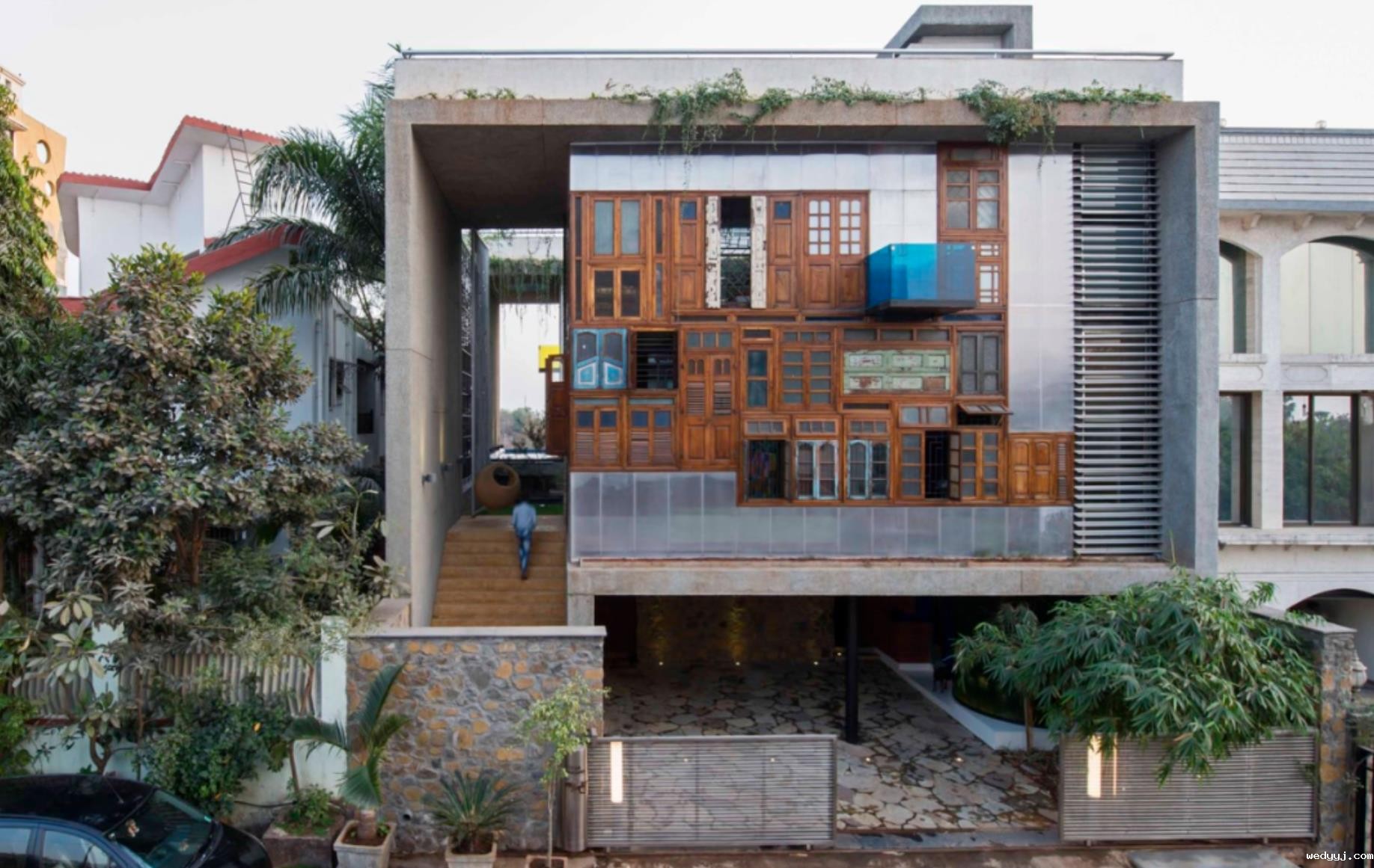 “拼贴之家”是印度孟买一个四代之家的住宅,设计师从印度特有的碎片化街巷景观中吸取了灵感,将大量回收建筑材料,如废旧窗户、回收砖块、老旧木条、上个时代的废弃家具、编织品废料、生锈的铁钉等,以不同的方式融入新建筑的结构中,以此向这座城市的历史致敬。此外,建筑还安装了雨水收集池等一系列资源再利用的设施,进一步减少能源消耗。这些带有历史气息的建筑材料和现代简约的设计风格搭配在一起,产生了一种传统与现代生活方式之间的强烈对比。