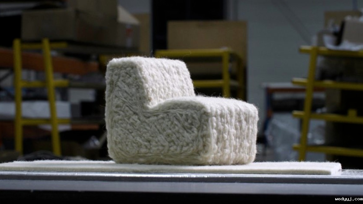 并不是所有羊毛都能拿来做纺织品,例如欧洲地区许多绵羊品种的羊毛就非常粗糙扎手,因此被剃掉后只能被当作废料处理。为了将荷兰鹿特丹每年生产的5000公斤粗羊毛利用起来,当地设计师Christien Meindertsma与技术公司一起开发了一种机器人。这种机器人可以像3D打印机一样,在不使用粘合剂和水的情况下,将未经复杂处理的羊毛一层层连接起来,形成指定的三维物体。最开始,设计师主要利用这种技术打印各种具有绝缘、隔音效果的软垫类产品,随着经验的积累,现在机器人已经“进化”到可以直接打印出一个单人沙发座,未来还将有更多可能性被挖掘出来。